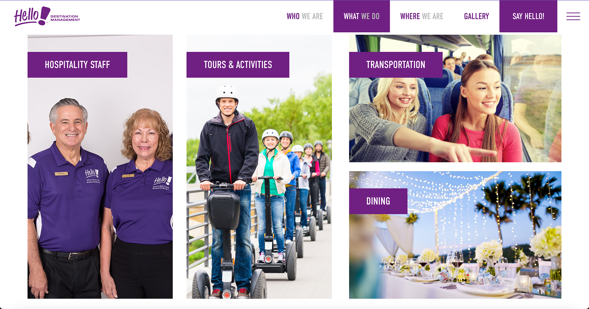 Global Event Planners website Agency: GoConvergence (Mood Media) Client: Hello DMC URL: https://growingbolder.com Tech Stack: WordPress , PHP, React, HTML, SCSS, Javascript